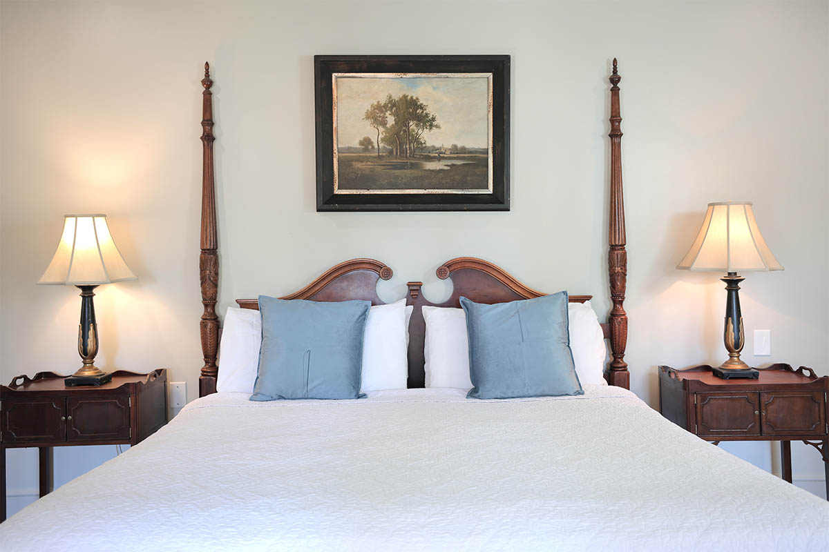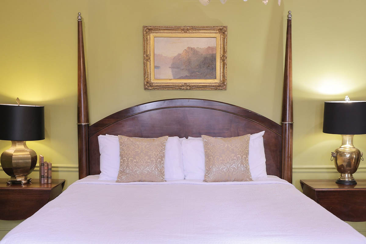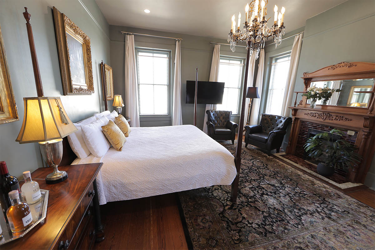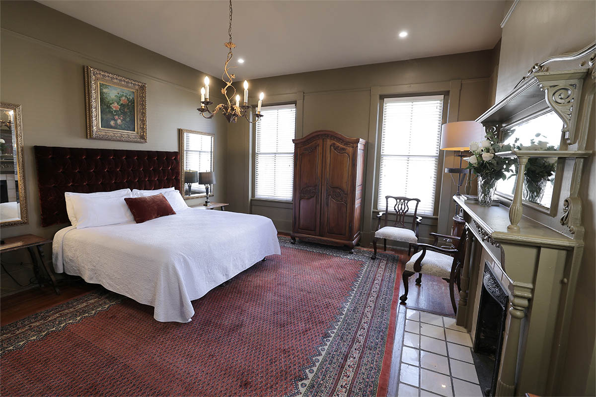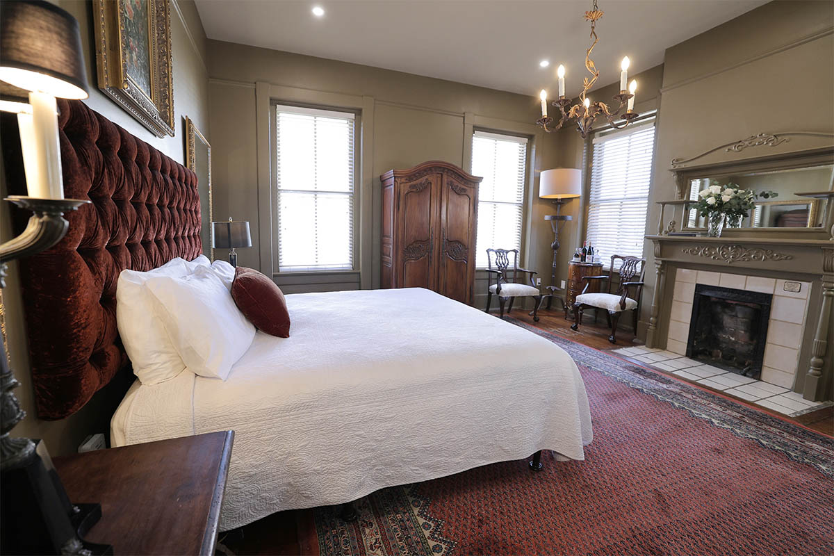 Once the master bedroom of this historic 1858 inn, this refined space features a beautiful bay window overlooking Savannah’s iconic Chippewa Square.